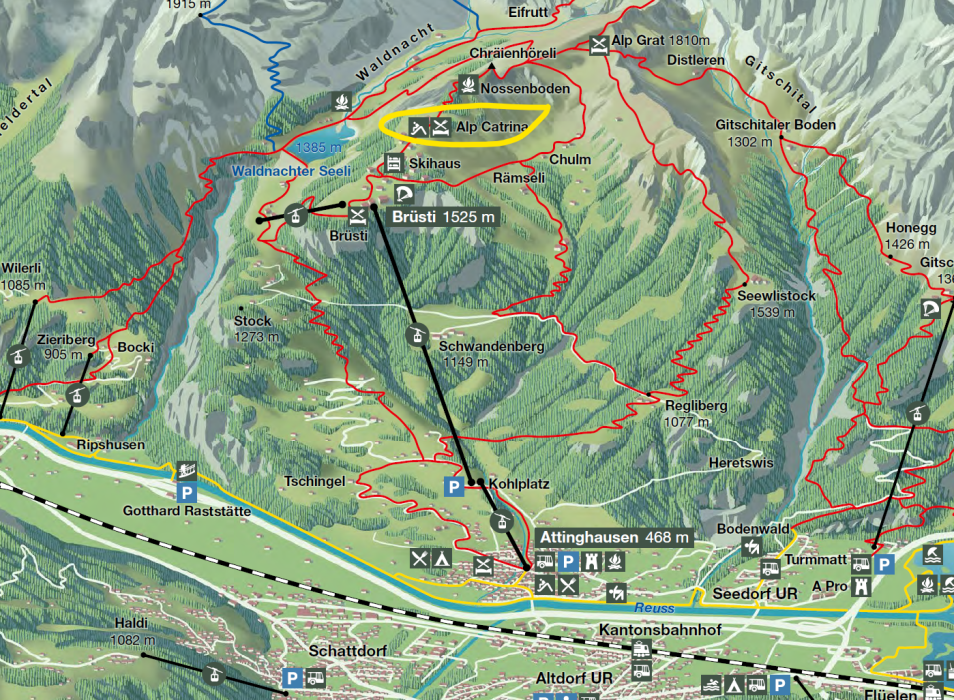Die Luftseilbahn Attinghausen–Brüsti führt vom Dorfkern Attinghausen auf 493 m ü.M. in zwei Sektionen aufs Brüsti 1’525 m ü.M. Ein direkter Busanschluss führt Sie zur Talstation. Parkplätze (Gebührenpflicht am 1.12.24) sind bei der Mittelstation «Kohlplatz» vorhanden.